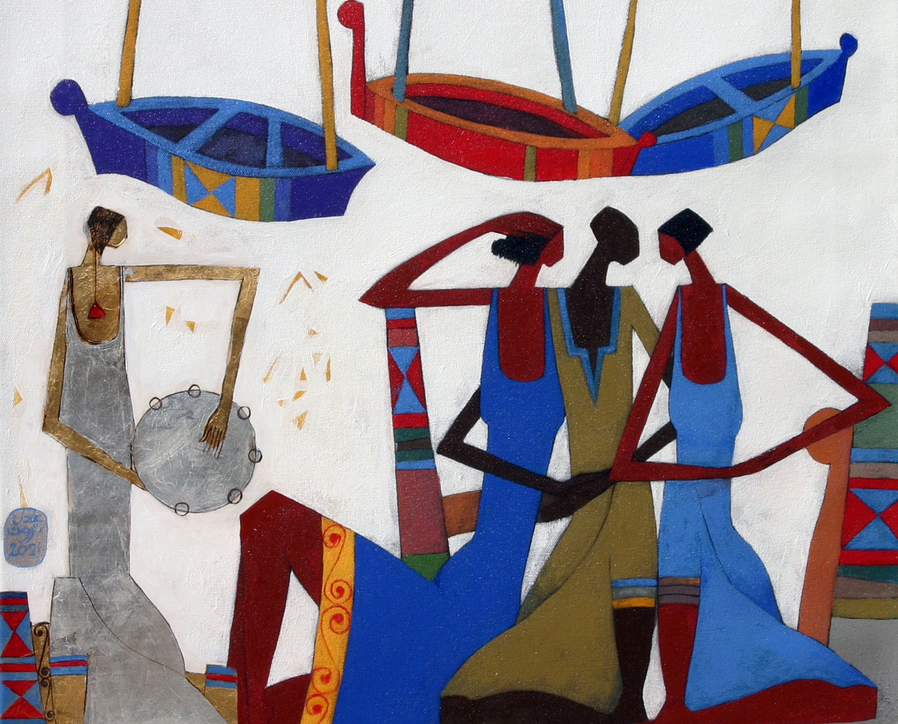 In this exhibition, I present a group of paintings in which the content is for readings in Sufi poetry and folklore – MAWAL is also the visual inspiration of folk rituals and transmitted spoken narratives, especially in marital relations and its folk totem rituals. All of them were my sources of inspiration to create, not in a simulation or visual translation form, but as a conceptual basis for the expressive content of my paintings. That Sufi poetry and songs are related to the life cycle and the rituals of marriage Starting with the sprinkled salt – ululating, drums, and tambourines, until the night of henna and its inherited rituals and myths. All of these rituals include coded taboos and signs in which case their visual content was either direct or hidden. These sources sparked my visual revelations for my paintings.”
