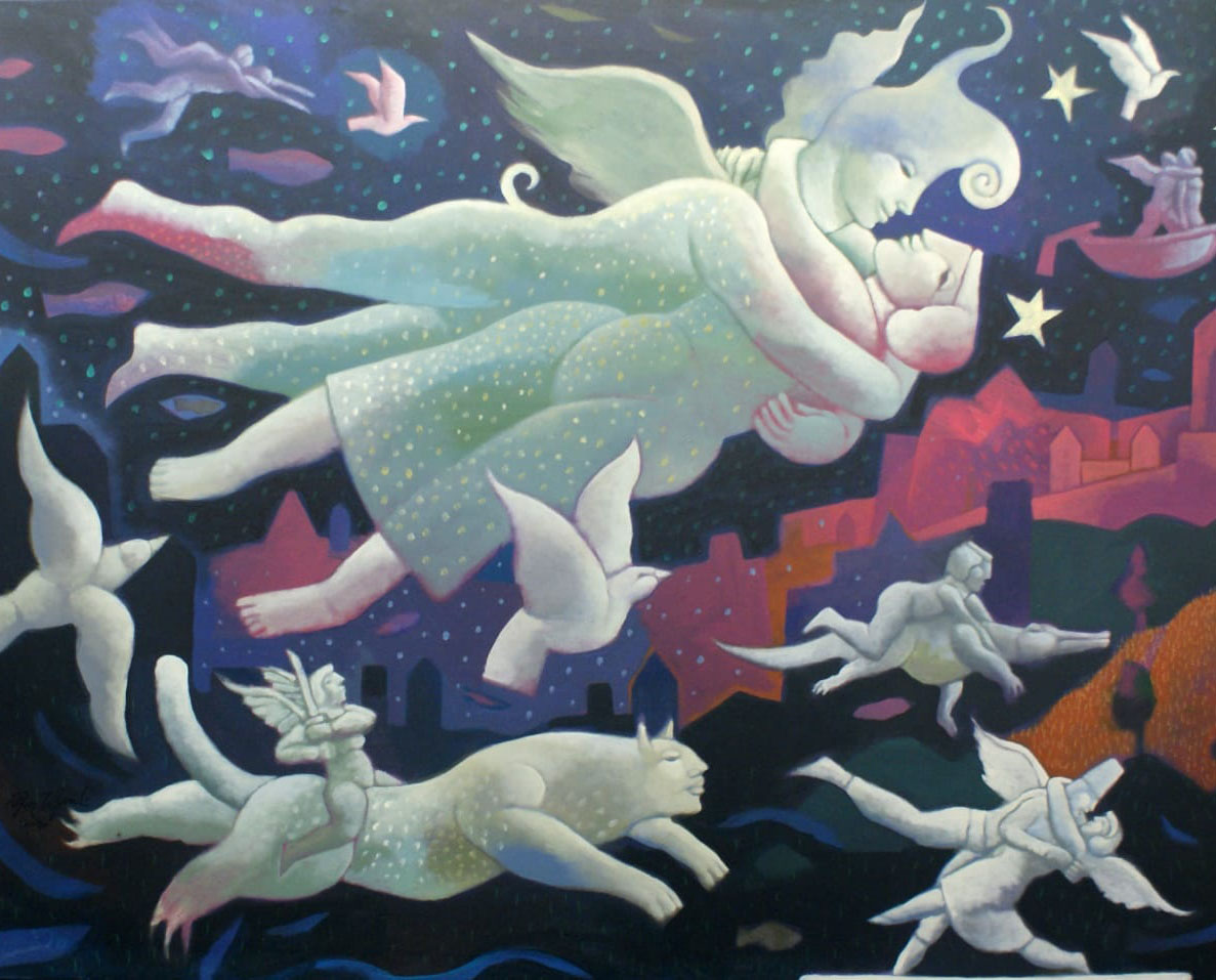 The journey has begun. A new dawn awaits. Moving through the swirling air, past the clouds and over the rooftops and spires of the city. We glide over landscapes of every place the artist has ever visited from post-industrial East Berlin to the spires of London, the green hills of Tuscany and the monumental forests of Canada – memory merged into dream. always moving toward a new place of being, a place of hope.