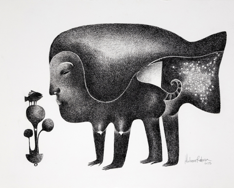 The surface of paper is influenced by many elements — light, water, and air. This year, I felt affected by them all — and, in fact, I wanted to embrace them all within my works, attempting to connect these natural elements with the inputs of each painting, as a personal challenge to use every tool without exception. The subject doesn’t come first, nor is the idea imposed beforehand. It forms gradually through the artist’s journey and long process of creation, until all these elements mature within him. Just as there is a right moment to stop working on the surface of the paper or canvas, there is also a right moment to release the idea — to present it, to raise questions, and to open paths for contemplation. Why? Because within my mind this year, a strange light ignited — creating a delightful sense of confusion. At times, I played with the brush and water, shaping worlds I had long imagined. I observed light and its influence throughout the year — on the leaves, the surface of the sea, the sky at different hours… and even on the faces of friends. At night, I allowed things to be wrapped in mystery, letting colors interact with the open air, leaving many questions within me. The colors produced fascinating effects that I discovered each morning. Yet I also wanted to mix sand with water. I used charcoal carefully, avoiding full fusion — perhaps because I didn’t want to disturb their clarity, or maybe to preserve that contrast between two rich, independent materials. It wasn’t planned; the elements imposed themselves on the paper’s surface as if they had their own will. The light of morning and the stillness of night became familiar characters in my world. I observed them closely, and they continue to captivate me each time they reappear in my work. So, I decided to hold a celebration —inviting all those elements that accompanied me this year. I made hats for them, fitting for the generous daylight I love to see every morning, and at night, I created faces and masks that matched those morning hats and their vivid colors. Some fear masks because they hide the truth. But that isn’t always true — masks were created so that we can add beauty of our own making. This year was a blend of techniques and visions, born from the womb of many ideas that converged in my mind. I wanted to present them all — to share the deep joy I felt while working with acrylic, charcoal, and cotton paper. It was my attempt to recreate beings and worlds that remain alive within me, and that I don’t think will ever leave. “Color possessed me; I no longer pursue it — it now possesses me forever… especially black, which absorbs everything and gives everything depth”
